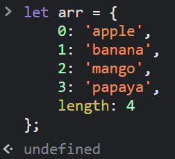 꼭 index 순서는 0번부터 시작해야 하며, length를 반드시 포함하고 있어야 한다. 이 조건이 만족하지 않으면 유사배열객체라고 인식하지 못하거나 에러가 발생한다.