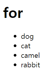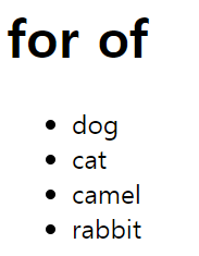 document.querySelector('#for').innerHTML += `<li>${animals[i]}</li>`