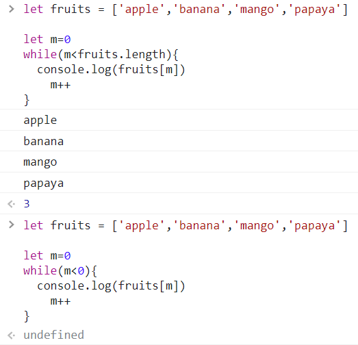 하지만 위 예제가 do while문이었다면 false임에도 적어도 한 번은 출력되기 때문에 apple이 한 번 출력된다.