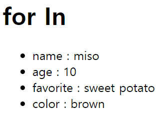 for in 반복문은 객체의 속성을 반복하여 작업을 수행한다. 위의 예제의 경우 myDog라는 객체의 속성인 name, age, favorite, color를 반복하였고, 마찬가지로 myDog [item]으로 그 속성의 값도 가져올 수 있다
